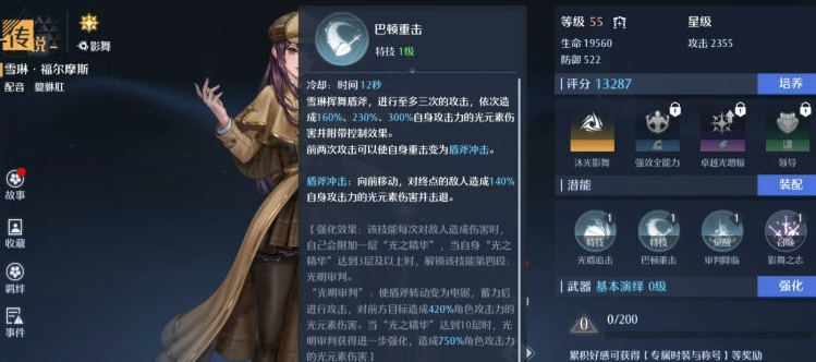 巴顿重击:冷却时间12秒。雪琳挥舞盾斧,进行至多三次攻击,依次造成百分之160,230,300自身攻击力的光元素伤害并附带控制效果,前两次攻击可以让重击变为向前移动,对重点敌人造成自身百分之140自身攻击力光元素伤害并击退的盾斧冲击。十分暴力的单体输出神技,不仅自带两段突进和控制,整体伤害还相当恐怖,相信在PVP战场上这会是雪琳的主要伤害来源。