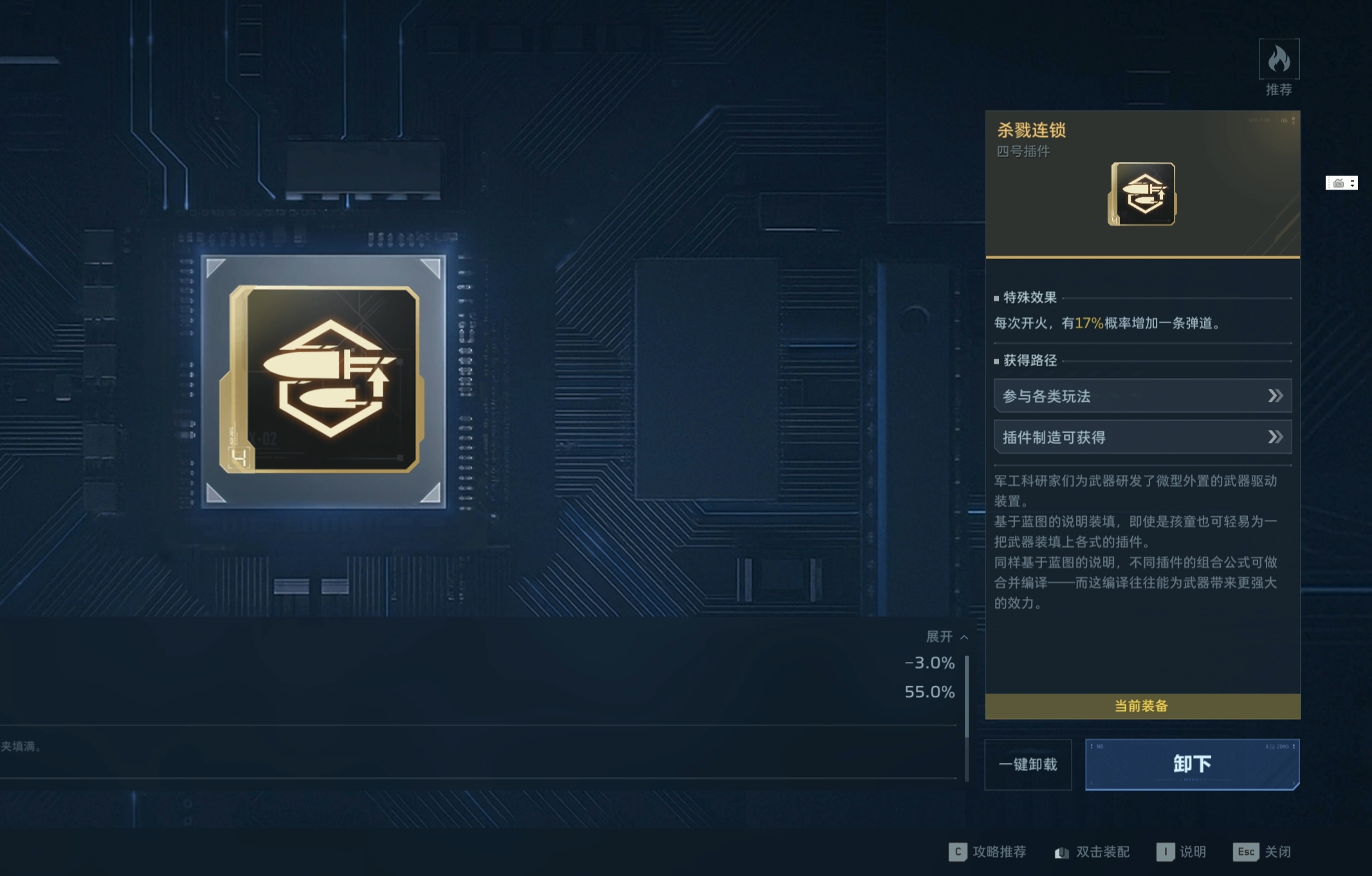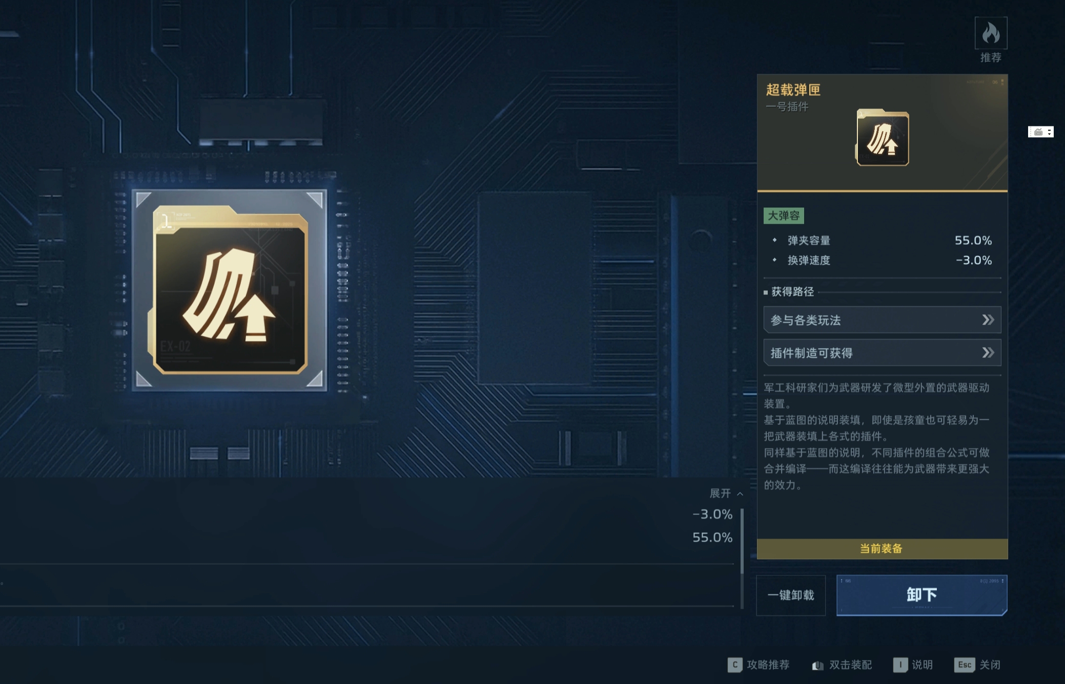 一号插件首选“超载弹夹”,能直接增加80%的弹夹容量,原本38发的弹匣直接涨到69发,持续开火续航拉满,不用频繁换弹打断输出节奏。要是前期没拿到,“充能弹药”也是备选,用技能就能回满子弹,配合主动技能实现“无间断射击”。