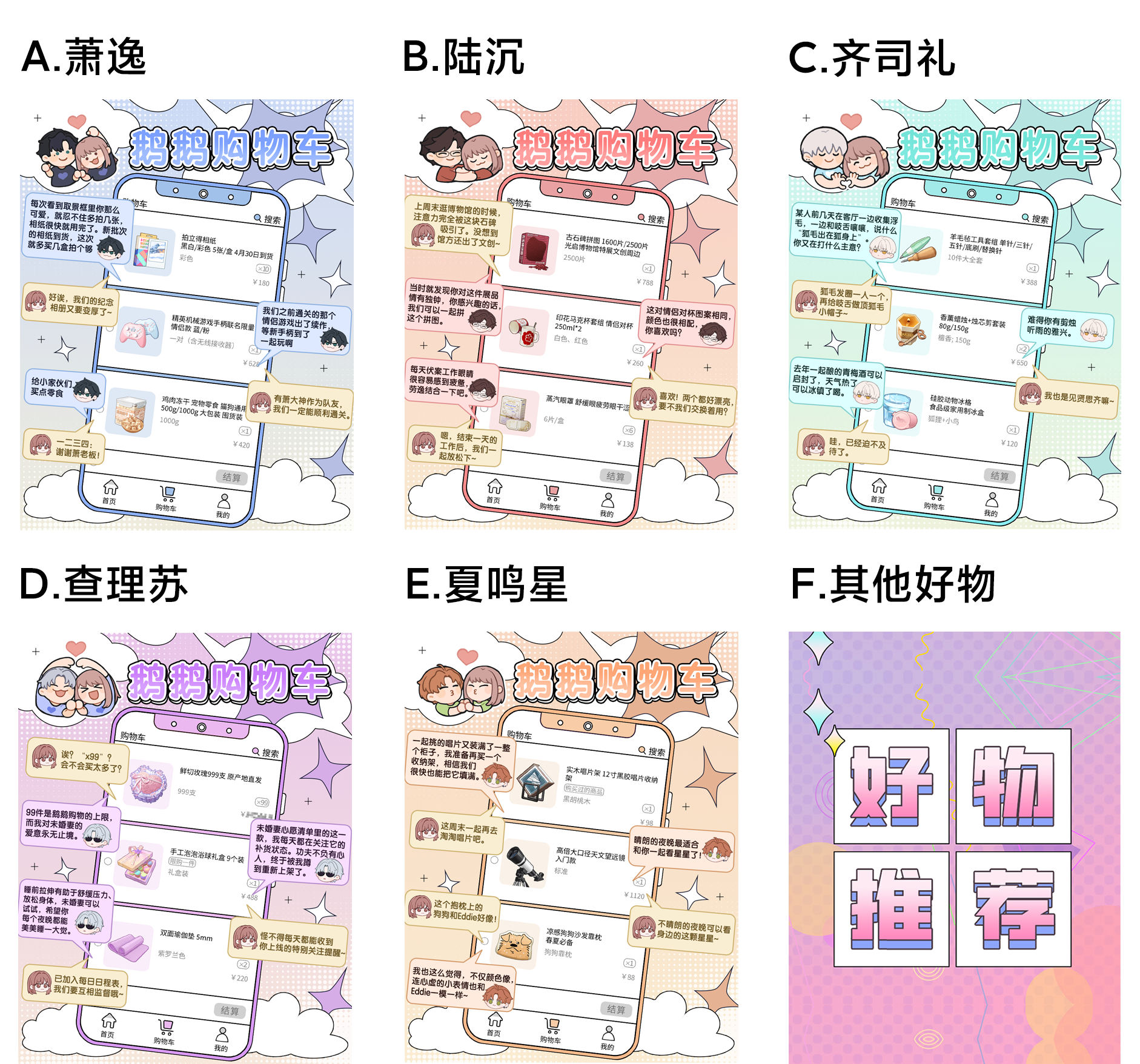 嘀嘀嘀,光与夜之恋的鹅鹅购物车已上线!快来看看五位男主都在购物车里面加购了哪些好物吧~萧逸有拍立得相纸、游戏手柄和宠物零食;陆沉有周边、情侣杯和蒸汽眼罩;齐司礼有羊毛毡工具、香薰和冰盒;查理苏有999朵玫瑰、浴球和瑜伽垫;夏鸣星则有唱片架、望远镜和沙发靠枕。那么谁的购物清单正中你们的红心呢?在评论区分享最近你们种草的生活好物吧,参与投票就有机会赢Q币~