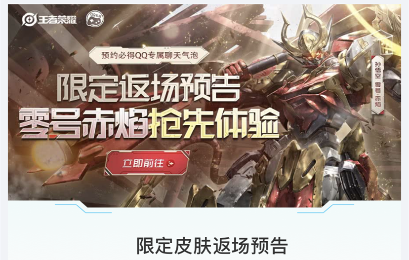 大家可以看到目前,官方已经开始正式预热孙悟空的限定皮肤零号赤焰的返场,这款皮肤是在去年的1月8日上架的,到现在为止已经满一年的时间,他已经有了返场的资格。