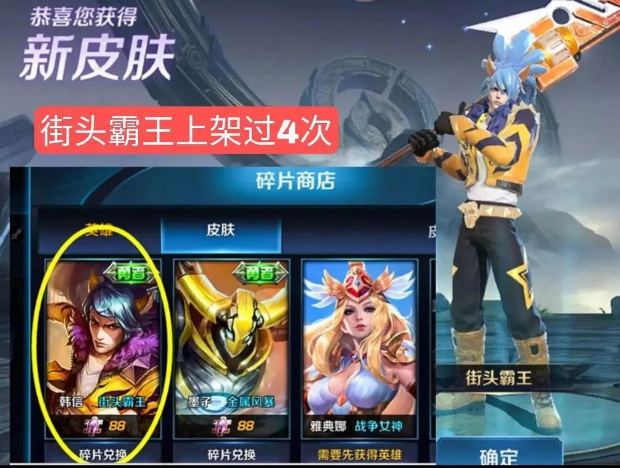 首先第一点,韩信的街头霸王他上架过皮肤碎片商店,在我的印象当中上架过4次。