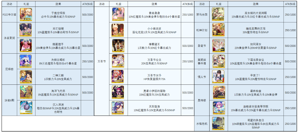 礼装包括以上22张,这里标记了礼装获取的活动、礼装名字以及满破的效果,毕竟礼装基本都是可以获取满破的,采用礼装小图也稍微避免一下一些礼装的完全卡面不太适合放出来。