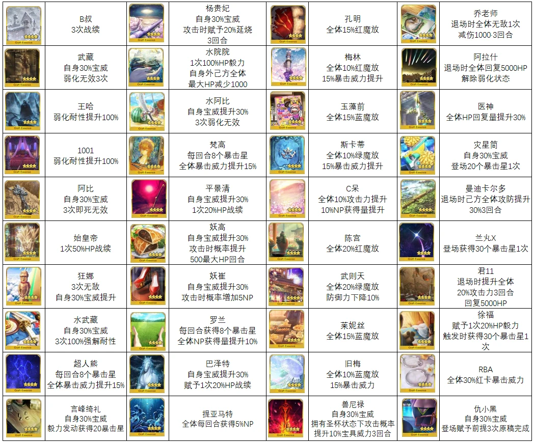 ①全体buff类型:其实大多数从者的羁绊礼装都是全体buff,但是考虑到目前用得上羁绊礼装的情况都是在高难场合,所以一般优先会驻场的大拐的全体buff礼装,类似C呆、梅林、玉藻前之类的。