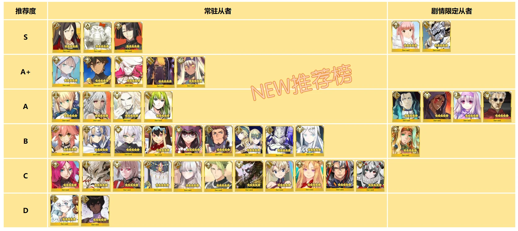下面的就都是暂时没有比较明显的表现机会,就按正常的强度优先级进行排序了,A级都是职阶内强度较高的,B级属于特定场合能用的辅助,以及可选范围内强度尚可的从者。