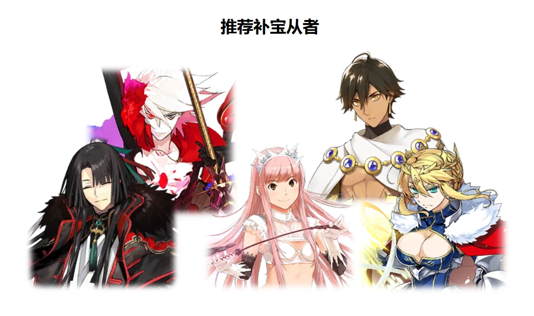 关于补宝,正常情况下的自选,个人还是比较推荐开图鉴比较赚,但是大部分从者都持有,想要补宝的话,个人是比较推荐这几位,主要还是针对冠位战这种比较缺乏伤害的场合,补充一下伤害更好在高加成状态下刷牵绊。