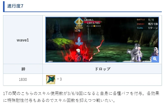 进行度7是黑呆战,持有人·秩序·恶·女性·人型·龙·王·呆毛脸·圆桌骑士·亚瑟特性,我方每使用3次技能(包含御主技能),对方就会提升1次耐性,幅度还挺高的,所以不建议一次性用太多次技能,慢慢开再解决即可。