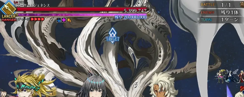 LB1是狂阶,持有天·超巨大·人类威胁特性,自带可解除的回避效果,开局减少我方全体30%NP,赋予攻击下降效果。