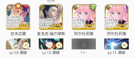 T1:C呆全技能给水武藏后换C呆13给水武藏2给自己,老福&水武藏全技能,决战服1,C呆+老福+水武藏宝具
