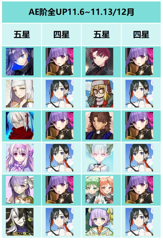 11月和12月的全UP卡池,由于泳装活动实装了新的四星AE阶水鹤,所以在搭配上就有变化了,有一半的五星AE会换成跟水鹤搭配。