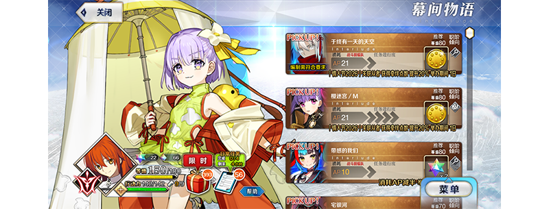 所有AE阶从者的幕间物语在周替期间限免,也就是说不持有也能打,大家可以清一下,也可以等到年底0AP限免的时候清,不过到时候正好碰上无限池和冠位战连开,可能会没时间清,需要注意均衡好打本的安排。