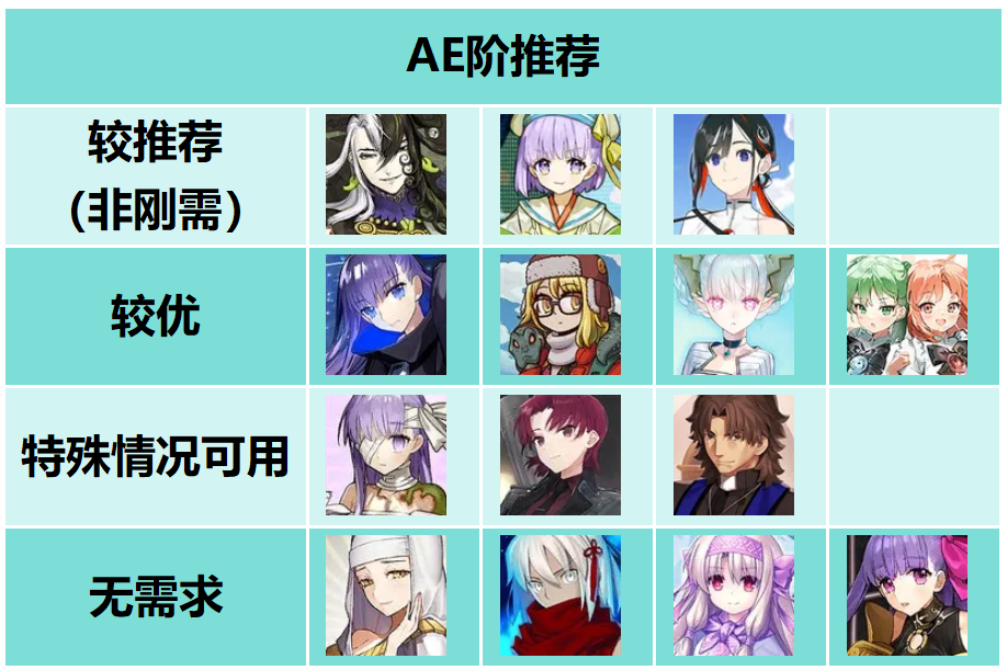 关于AE阶从者的个人抽卡推荐,因为EX职阶的冠位战是合并成2个的,AE阶属于EX2,这边有奥伯龙当辅助,所长当输出,其他从者都只是蹭牵绊,所以并没有特别刚需的情况。