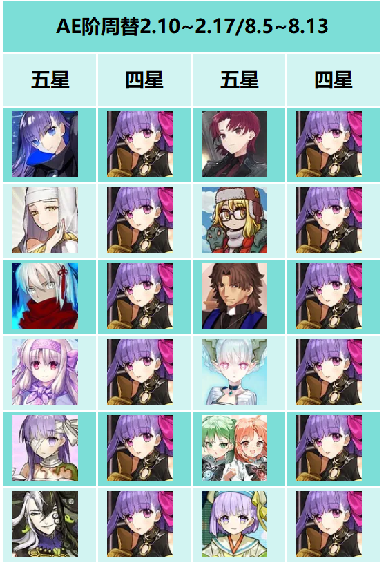 FGO国服将2月10日~2月17日开启AE阶全UP卡池,这里惯例介绍一下今年的AE阶卡池情况。