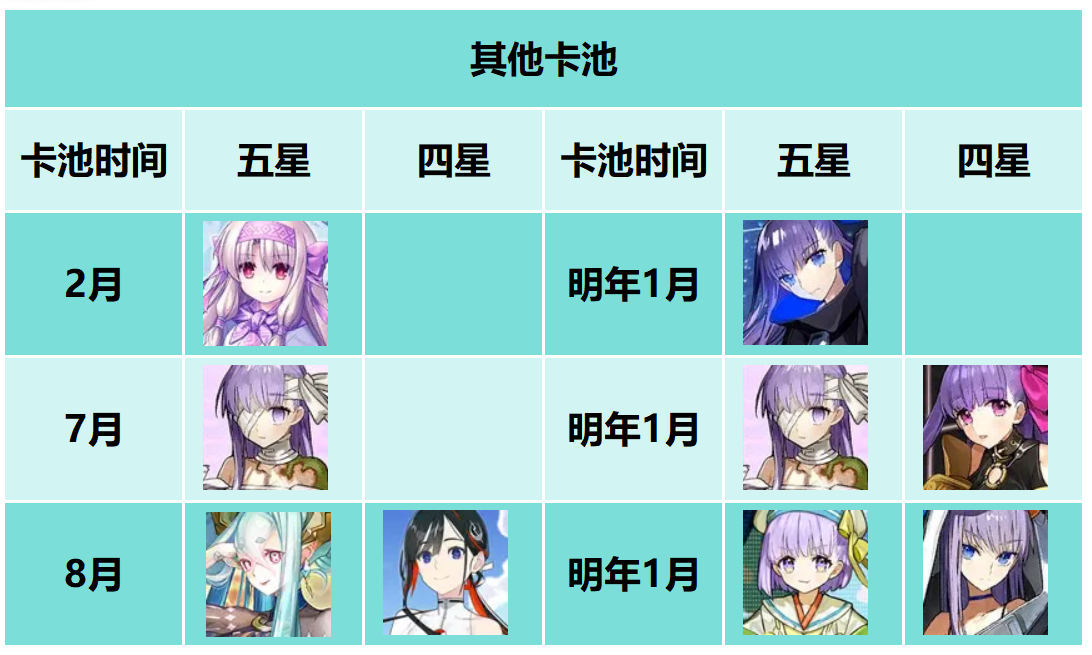 关于AE阶从者在非全UP卡池之外的其他卡池,包括以上这些,这里面其实都没太大的差异,就是水鹤的话,本身还是抽实装的时候跟水提妈一起的卡池更好。不过这也不影响上面的AE阶从者依旧推荐水鹤卡池,毕竟高宝作为副核使用更舒服,也能获得更多从者币。