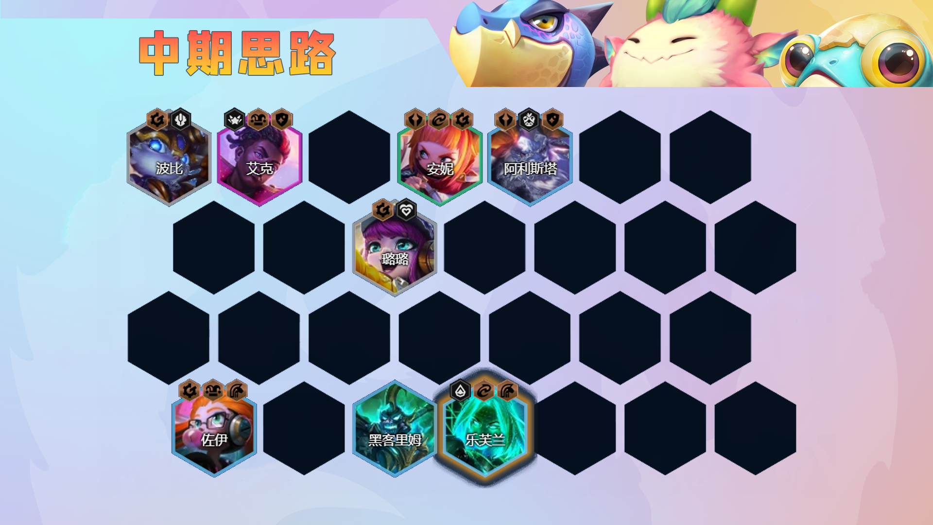 中期有乐芙兰和佐伊后就可以初步小成,此时的法师阵容很强势,尤其是佐伊和乐芙兰可以偷后排。