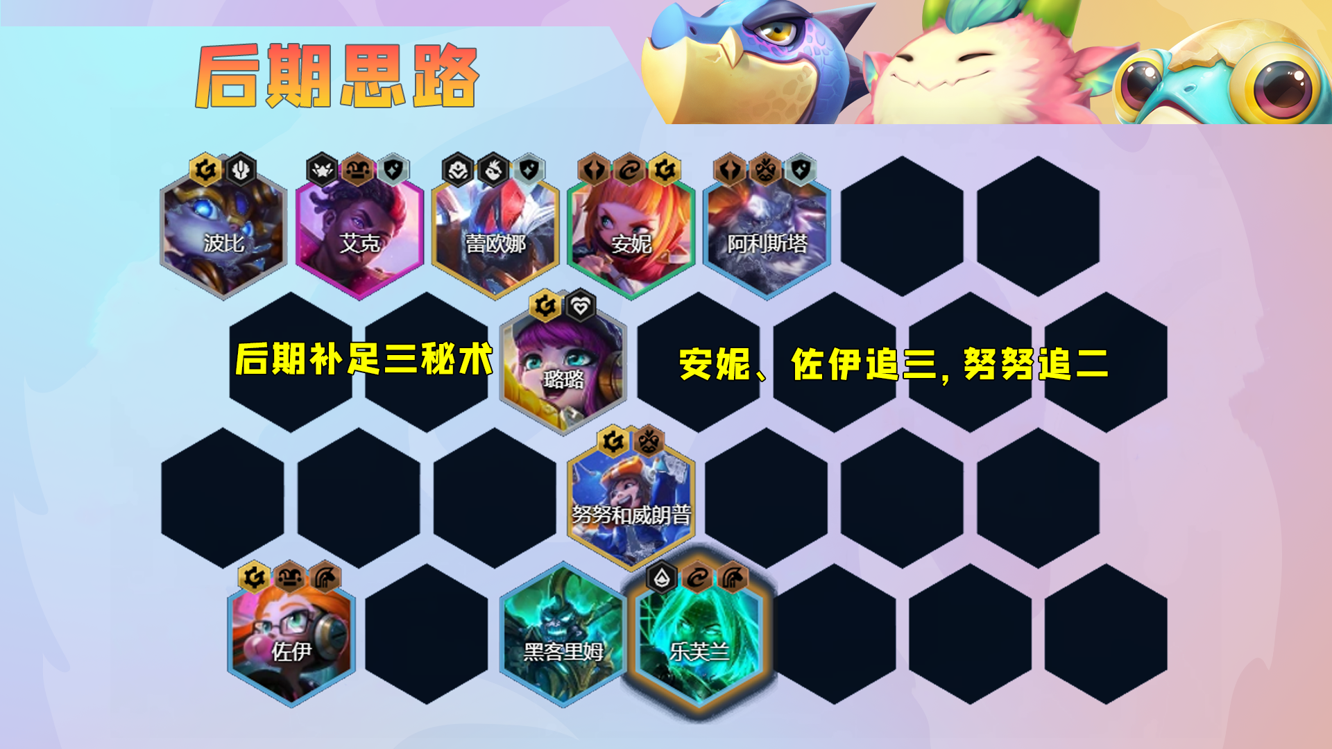 该阵容需要追三星安妮和三星佐伊,后期追一个二星努努就可以大成,运营难度不高,但上限很高,是一个非常稳健的上分阵容。