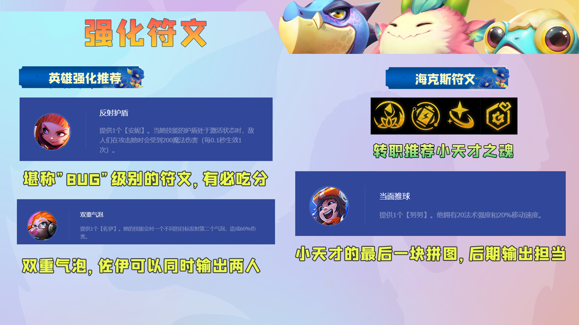双重气泡佐伊可以大幅度增加佐伊的输出,是佐伊主C阵容的必选符文。
