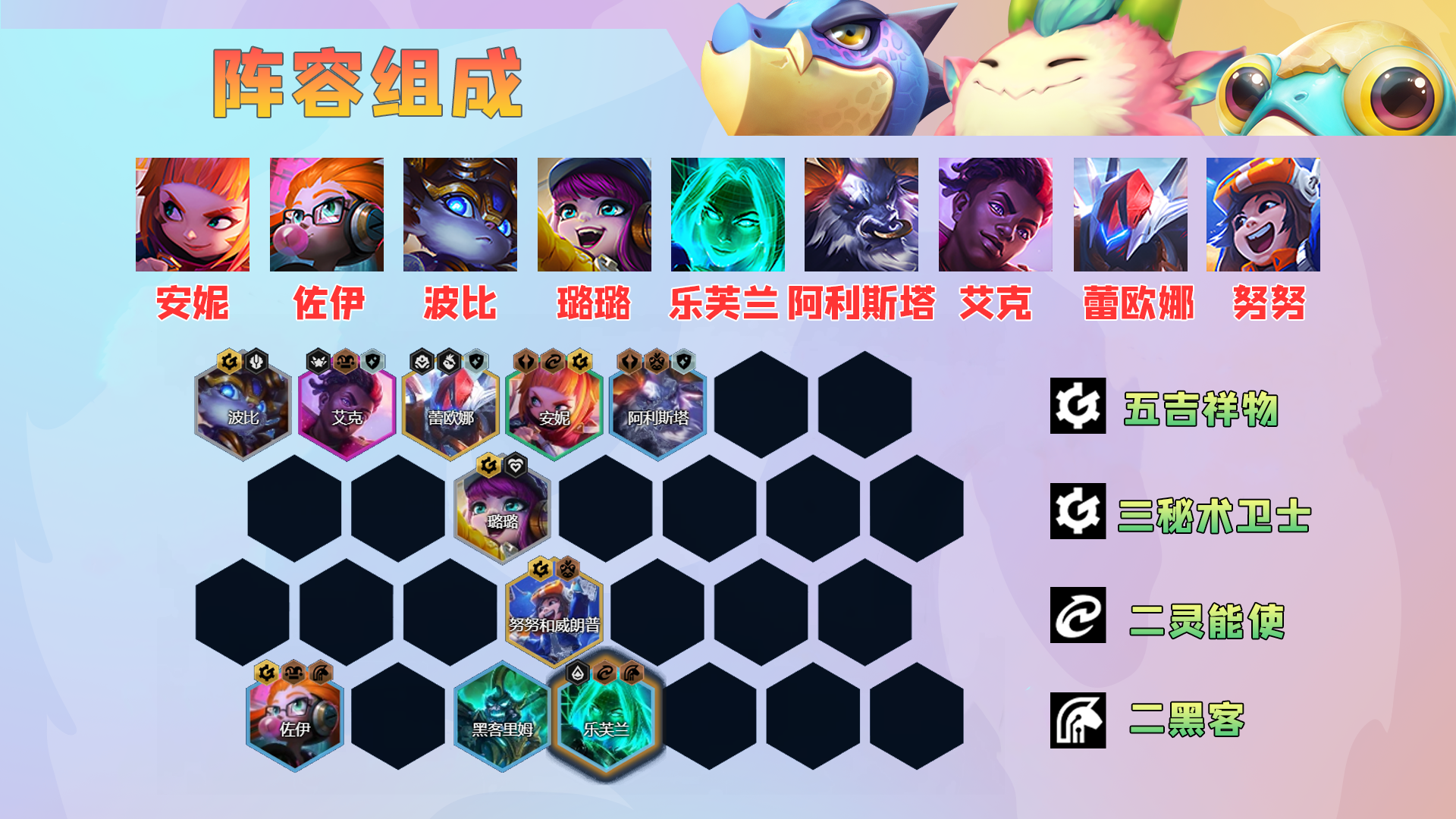 该阵容由安妮、佐伊、波比、璐璐、乐芙兰、阿利斯塔、艾克、蕾欧娜、努努组成,由五小天才、三秘术卫士、二灵能使、二黑客构成。