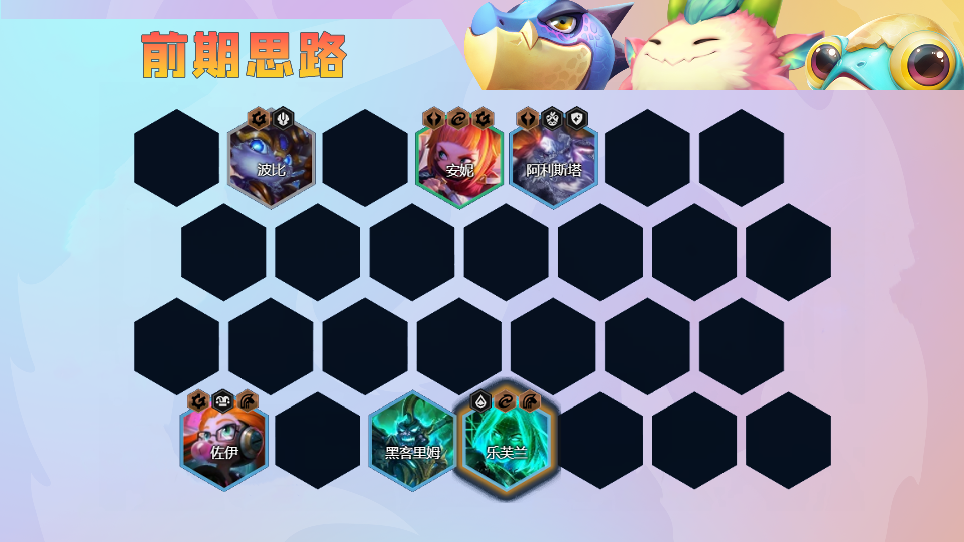 前期由佐伊或乐芙兰开局可以走连胜,如果没有的话可以使用二星棋子打工,小天才前期偏弱,不建议过早登场。