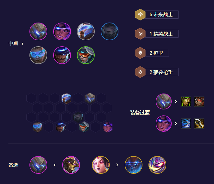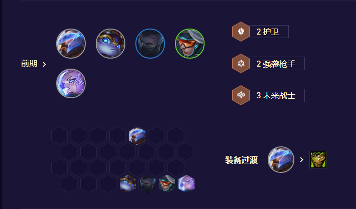 前期直接用3未来卢锡安或希维尔带输出装、前排潘森带肉装拼羁绊过渡即可,尽量是开局胡2星潘森/卢锡安或者有未来转等体系海克斯时去玩、过渡节奏会更舒服。