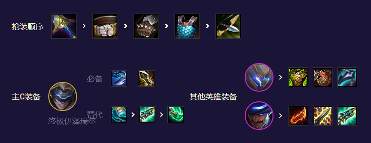 阵容理论上是终极EZ主C,装备方面可以做3输出、双EZ一个技能打爆发直接清场,也可以在有输出装的基础上做回蓝和续航装打持续;卡牌副C捡输出装,2星得早且D不到EZ时也可以直接带EZ装备当主C玩。阵容肉装一般是给体系外的坦克盖伦或剑魔,剑魔带装备会更肉一些,盖伦的优势则是能开2护卫且带控制,具体可以根据来牌和环境灵活选择。