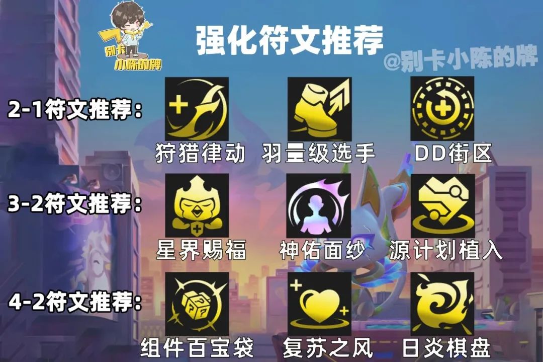 这套阵容所需的转职是决斗大师,那么我们遇到了决斗大师之徽以及决斗大师之心都是可以直接拿的,这样可以有助于我们开八决斗大师的羁绊,其次就是优先选择战力类的强化符文,搭配决斗大师超高的爆发可以做到清场效果,推荐小伙伴们优先羽量级选手,源计划植入,神佑面纱等,然后也可以选择续航类以及功能类的强化符文,比如:组件百宝袋,狩猎律动,日炎棋盘等。