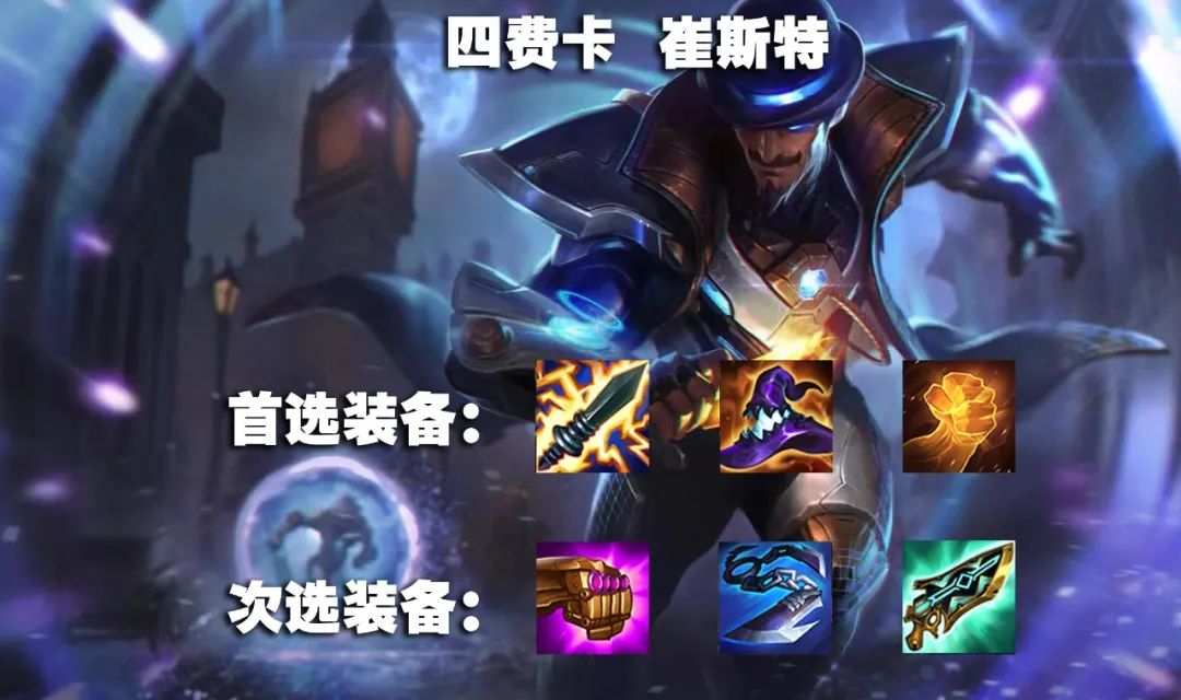 必备斯塔提克电刃,电刃不管是连胜还是效果都非常契合我们决斗大师阵容,多余的法系输出装备给予崔斯特,多余的物理输出装备给予薇恩。