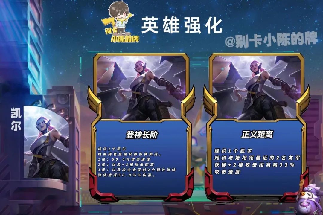 最好的英雄强化肯定就是凯尔的登神长阶,这个是阵容玩法的前提,如果没有拿到这个英雄强化在后期拿到了薇恩的扩散射击也可以考虑变换主c装备。