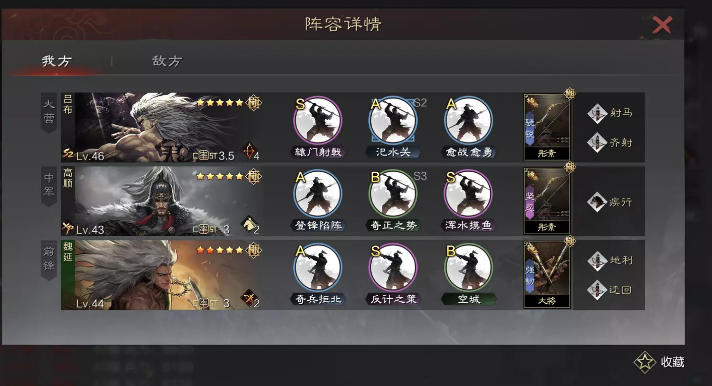 泗水关:本队输出手段的多样性 大营携带物理战法即可 可替换一骑人吕等 战法越好强度肯定越高