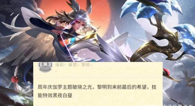 从曝光的海报来看,整体是以白色为主色调,伽罗穿着白色的长袍,手上拿着巨弓,弓是以松树为形,箭头是白鹤化成的,背景这是一轮升起的新日,这应该是白昼形态,整体给人感觉还是很炫酷的,有点开始期待黑夜形态了,不过也有玩家觉得,这应该是自制的海报,毕竟新皮肤刚开始预热,都是很模糊的。