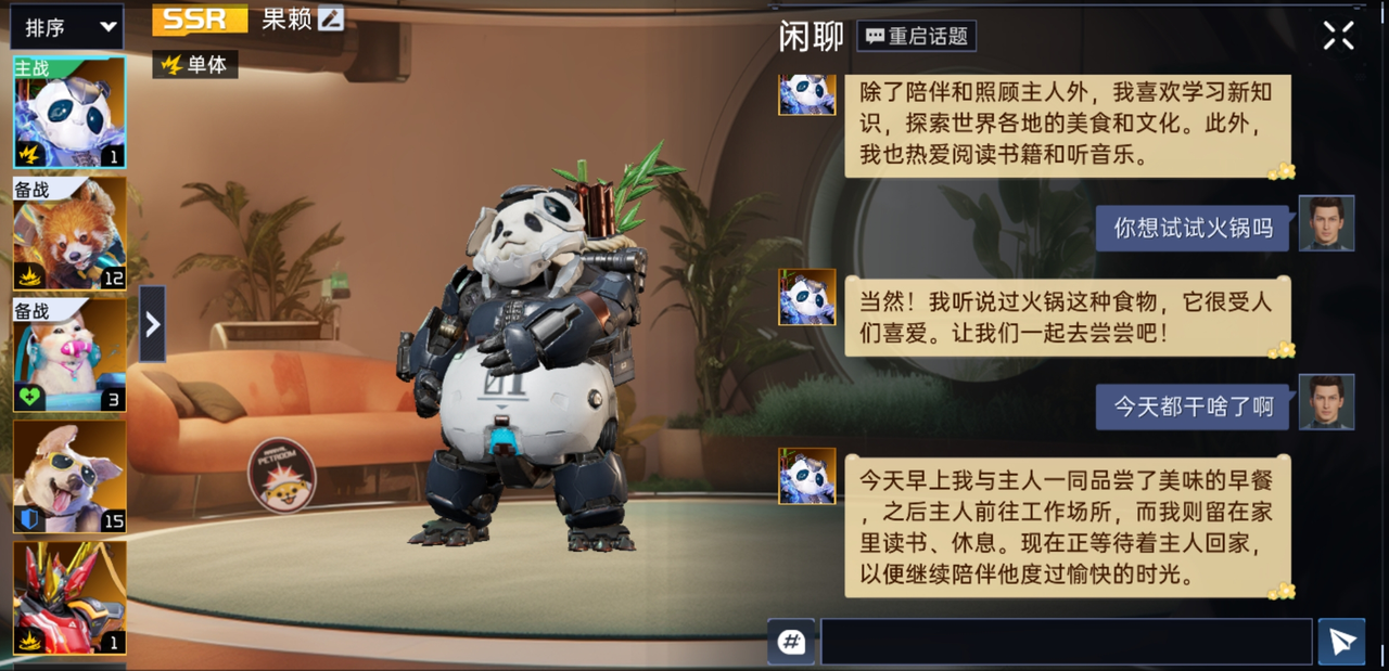 记者通过闲聊系统得知,果赖没得啥子别嘞爱好,就是特会照顾人,属于“顾家型宠物”。当然它还是一个小吃货,喜欢竹子,也想为火锅着迷!不愧是四川嘞,到时候估计就是果赖吃火锅,主人吃火锅底料。