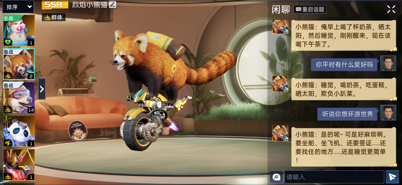 用白昼流星发射火焰碟片时有多帅,现在蹬独轮车玩耍的模样就有多可爱!被召回后的小熊猫依旧保持着在野生动物保护园时的“达芬奇冒险精神”,梦想环游世界,探索未知,而且它还有一个特别的爱好,总是爱去睡懒觉。
