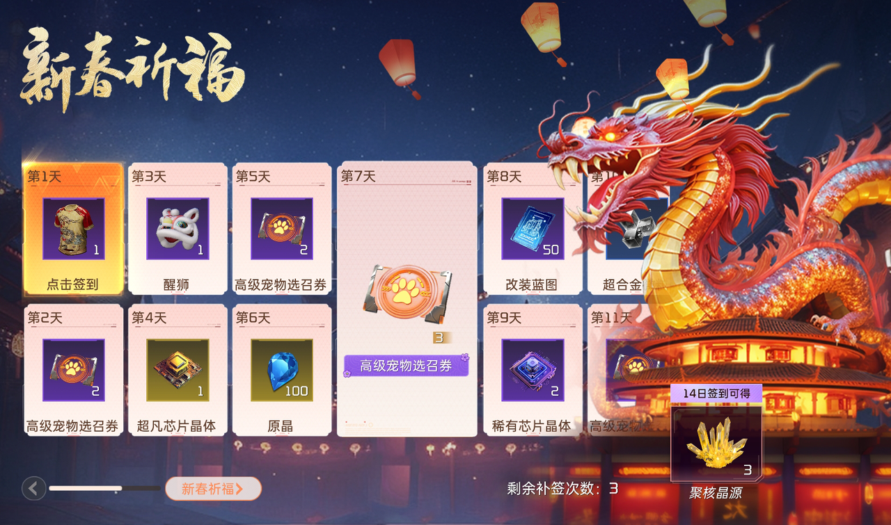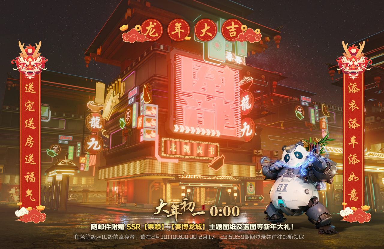 龙年除夕守岁,必须要给所有幸存者送波大的福利!那就领房领新宠,福气盈满天!大年初一0点后,在邮箱即可直接领取SSR宠物【果赖】和【赛博龙城】主题图纸及蓝图等新年大礼!