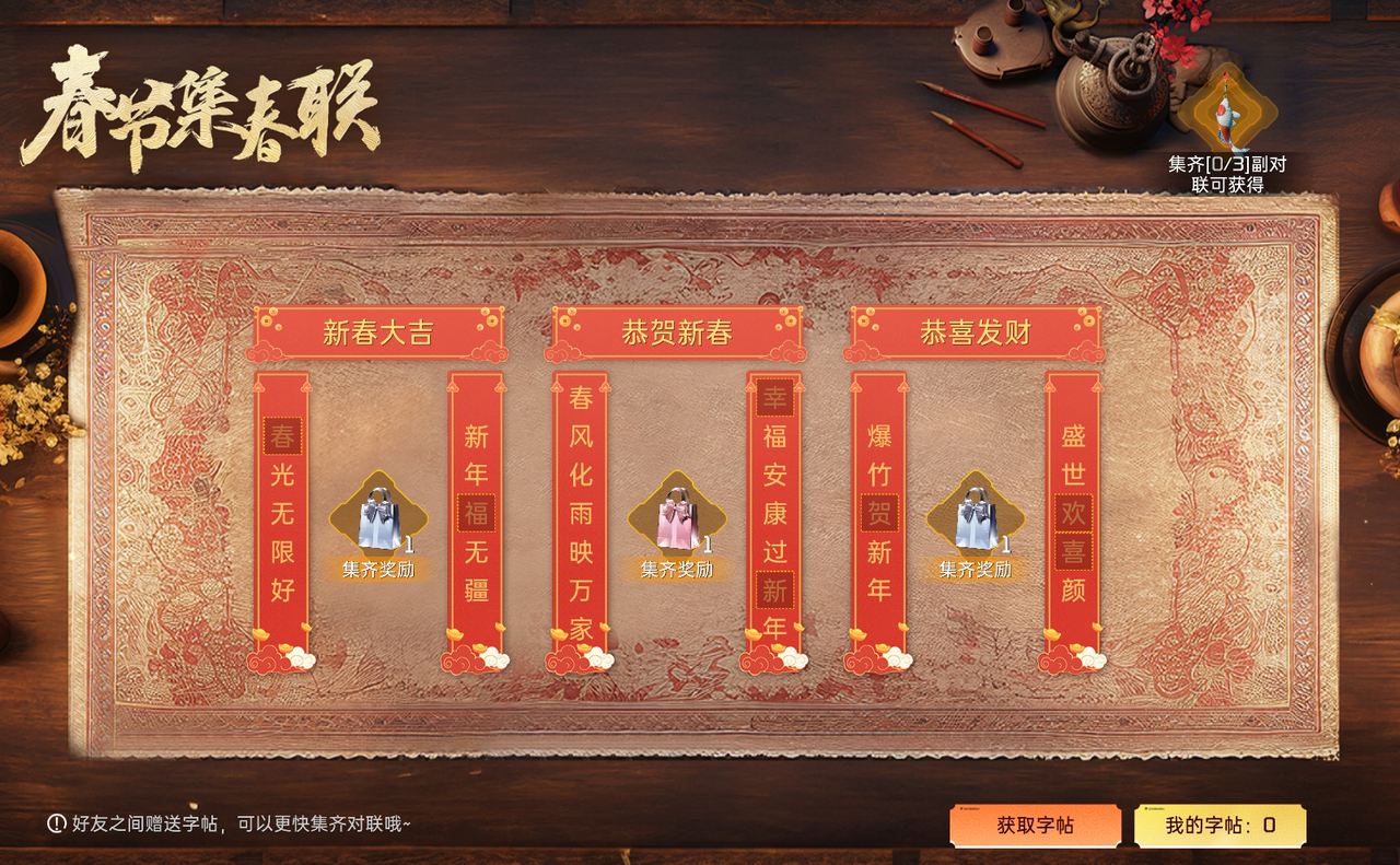 红纸寻字集佳句,吉语齐聚添喜气。过年贴新桃寓意着美好祝愿,但有三张春联上缺了字帖,需要幸存者前往收集“银柳”和“腊梅”兑换字帖,补齐即可获得福临新春头像框、聊天气泡框、趣味打麻将动作以及武器挂饰外观【池中物】~