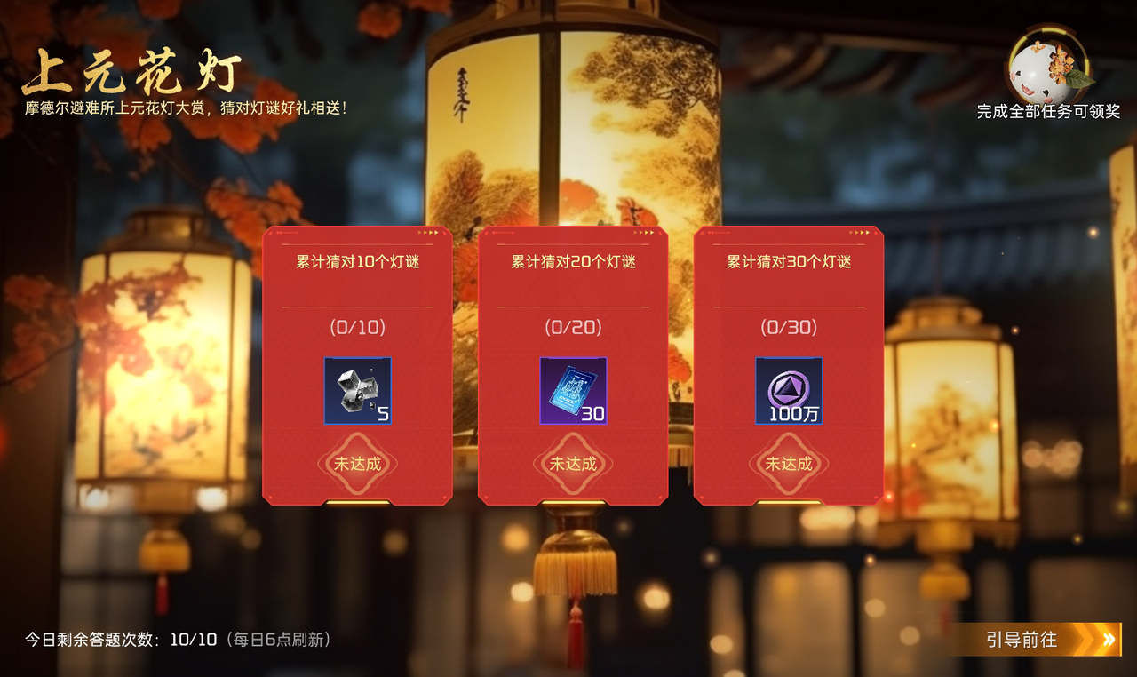 花灯谜面引思量,竞猜答案乐无穷。摩得尔避难所的龙灯下悬挂着谜面,答对答错都有奖,答对足够数量将会获得元宵节发饰外观【团团】。