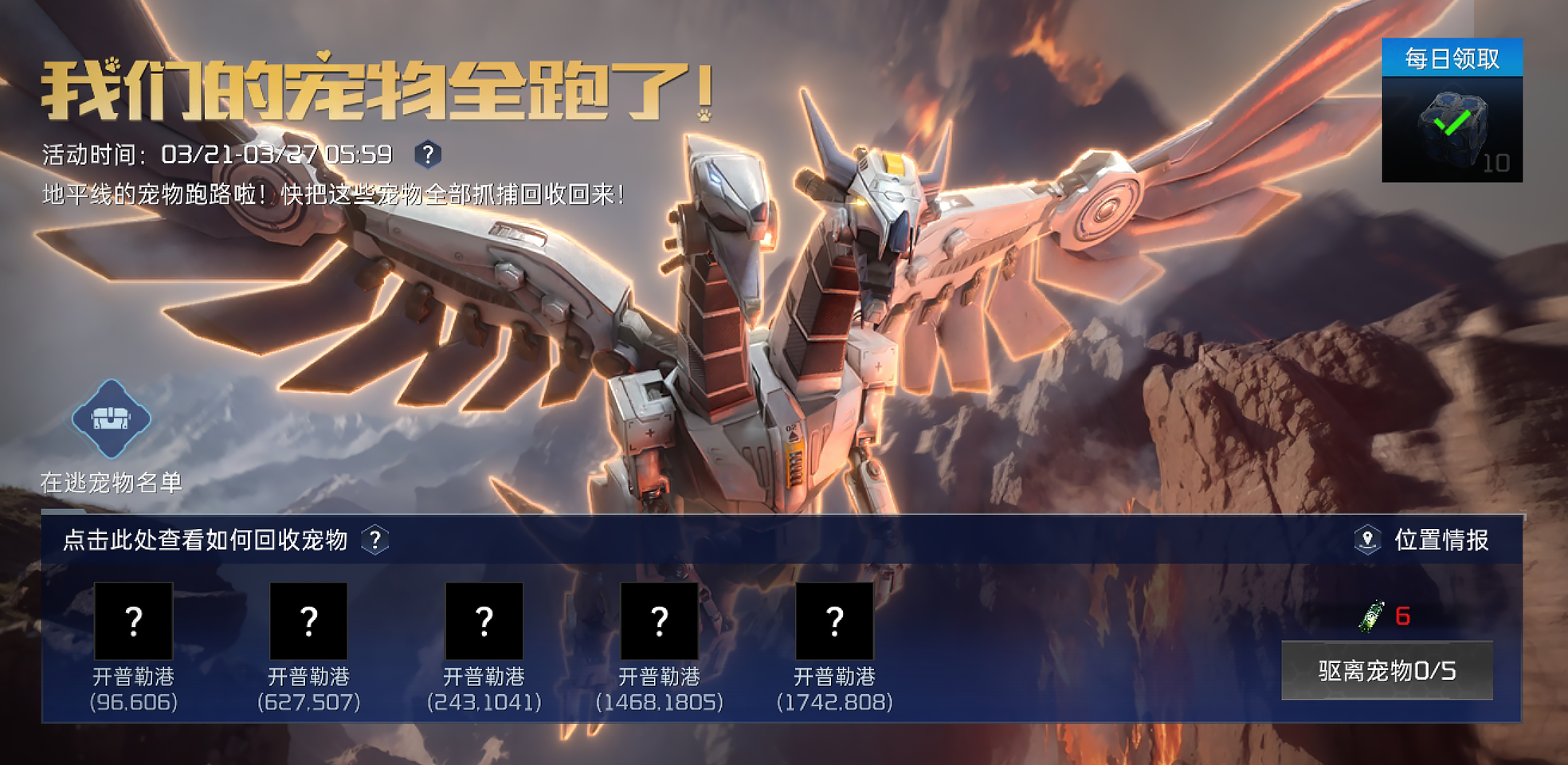 它跑我追,插翅难飞!截至3月27日,上线参与“我们的宠物全跑了”活动,协助回收在逃宠物们,可获得通用宠物数据,还有机会获得稀有宠物数据哦~