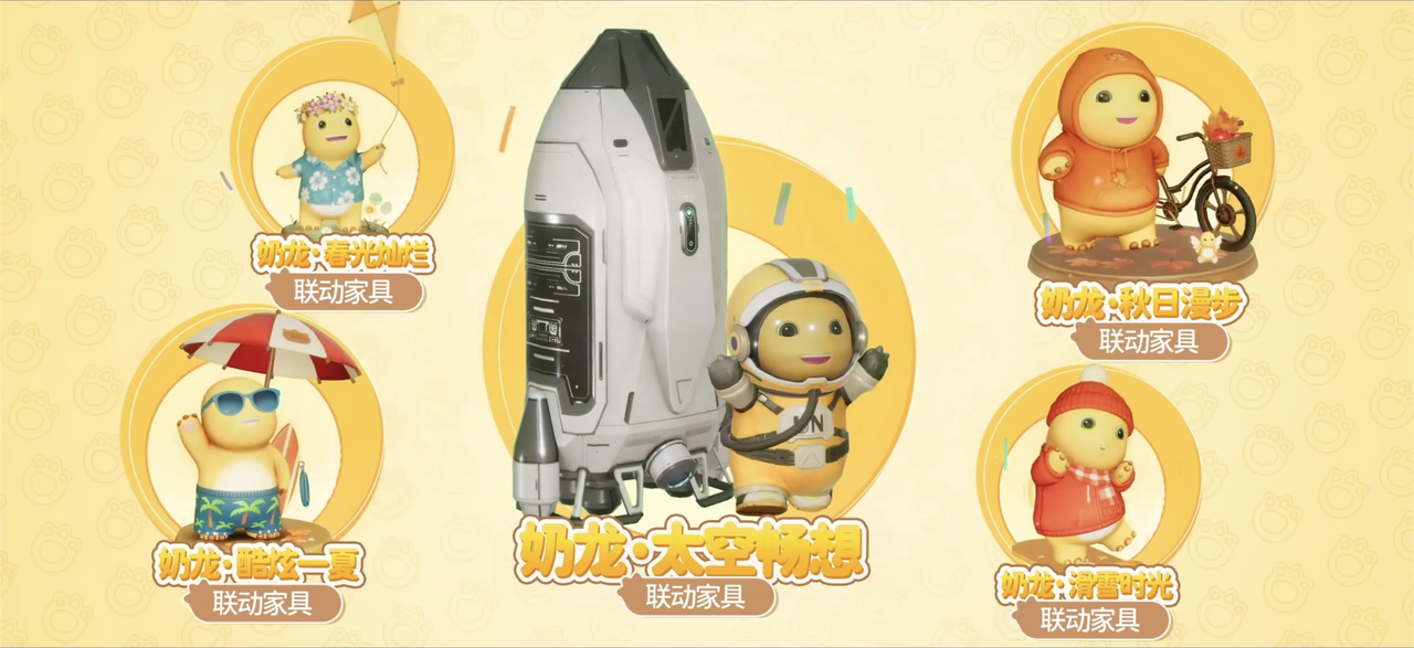 可变装家具:「奶龙·春光烂漫」、「奶龙·酷炫一夏」、「奶龙·秋日漫步」、「奶龙·滑雪时光」、「奶龙·太空畅想」家具也太可爱了吧!在3阶、5阶时还能改变外观,把这些家具摆满庄园,秒变奶龙乐园!而且收集完成隐藏成就,即有机会获得「自选颜色自选特性异晶宝箱」,颜值和实用都兼顾到了,阿姨都已经开始规划怎么布置庄园了!