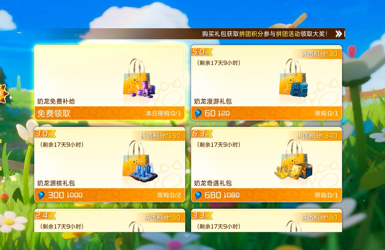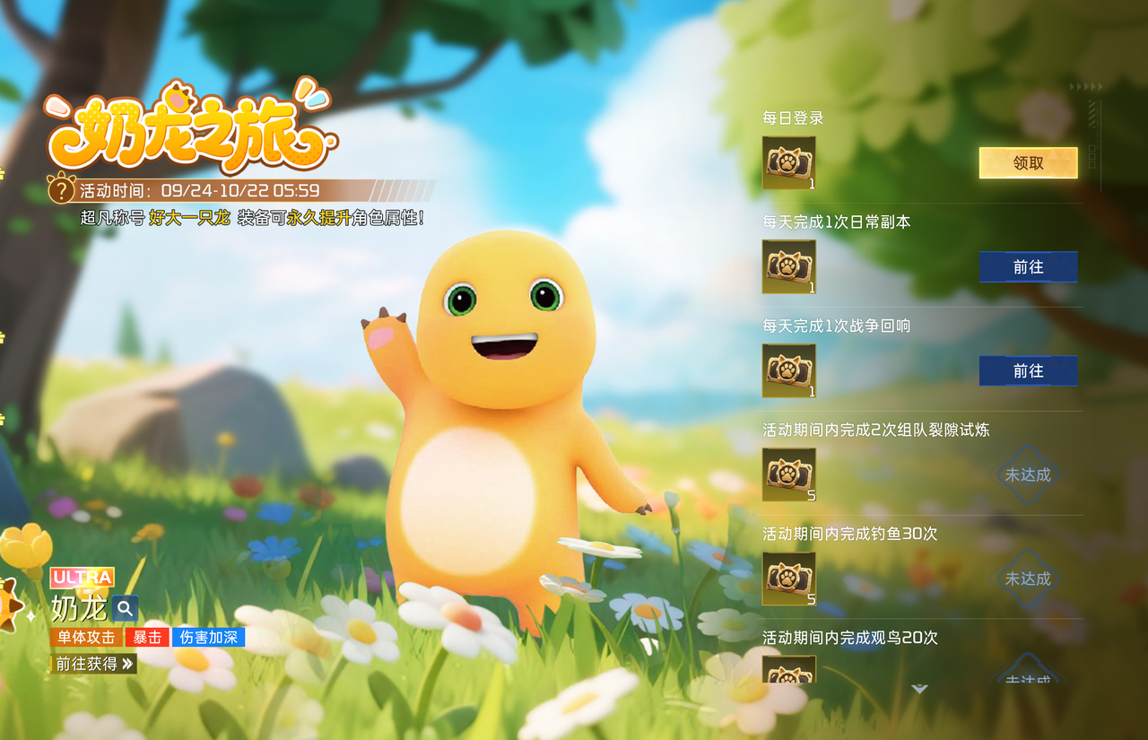 拼团礼包:参与限时活动攒积分,可兑换ULTRA宠物选召券、S战甲组件,还有「奶龙・笑语」红角鸮武器皮肤专属解锁!