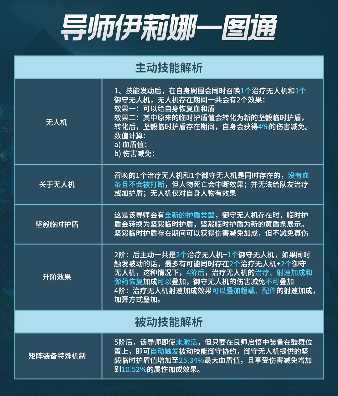 伊莉娜:技能发动后,会同时召唤1台治疗无人机和1台御守无人机,持续20秒。治疗无人机每秒能恢复0.8%最大血盾值,奶量特别稳定;御守无人机会提供12.04%最大血盾值的“坚毅临时护盾”,持有坚毅护盾时能减伤4%,不过真伤除外。