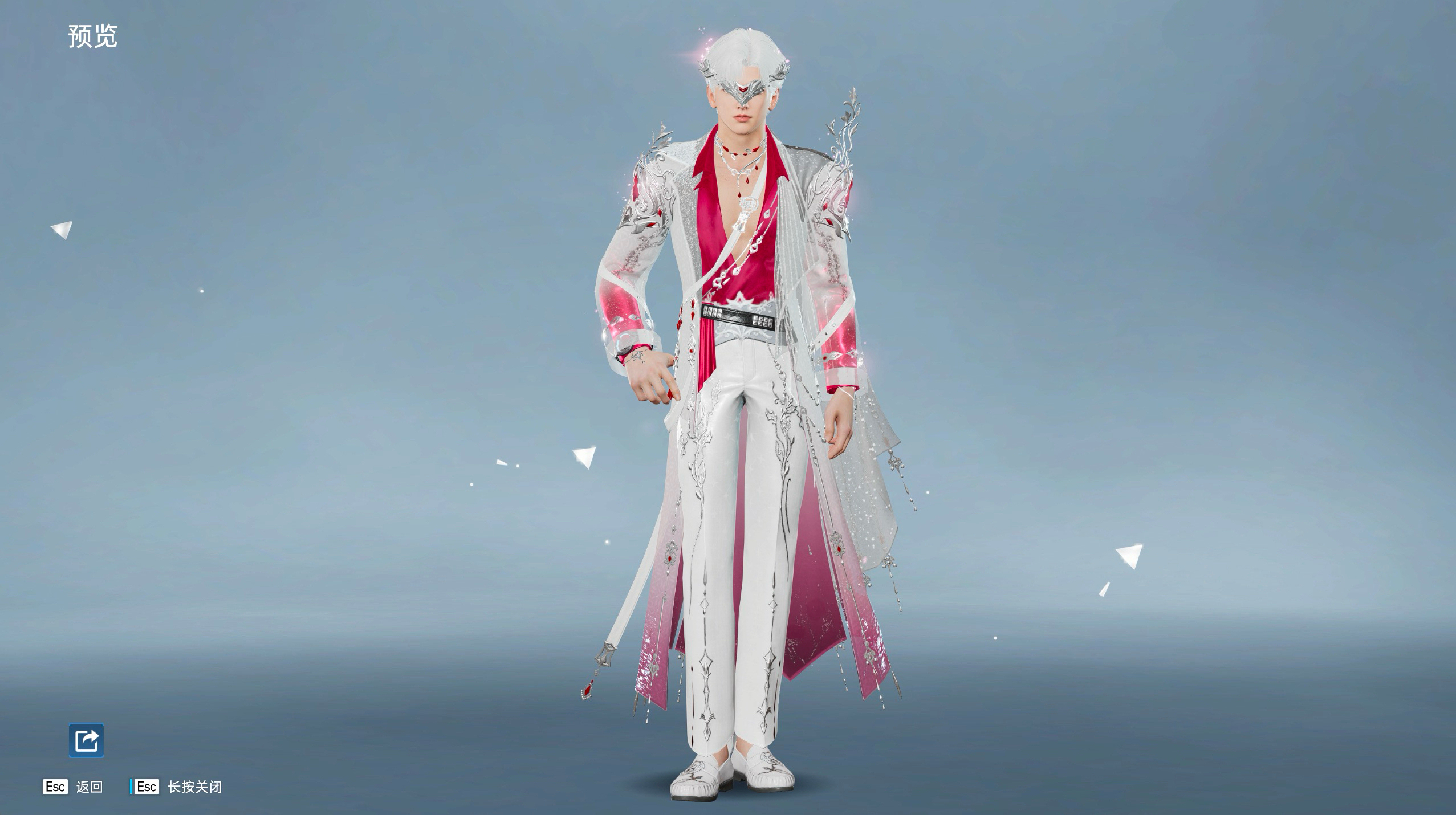 男款更是把 “优雅贵气 + 末世科技” 玩明白了!白红主调的长款外套飒气又精致,红衬与金属配饰的碰撞极具辨识度,每一处剪裁都透着贵气,再搭配机械质感面具,神秘感直接拉满,却又因科技感细节融入了废土风格 —— 这不就是掌控科幻伊甸的神秘绅士吗?谁又能猜透他是王子还是 “危险邀约者”?