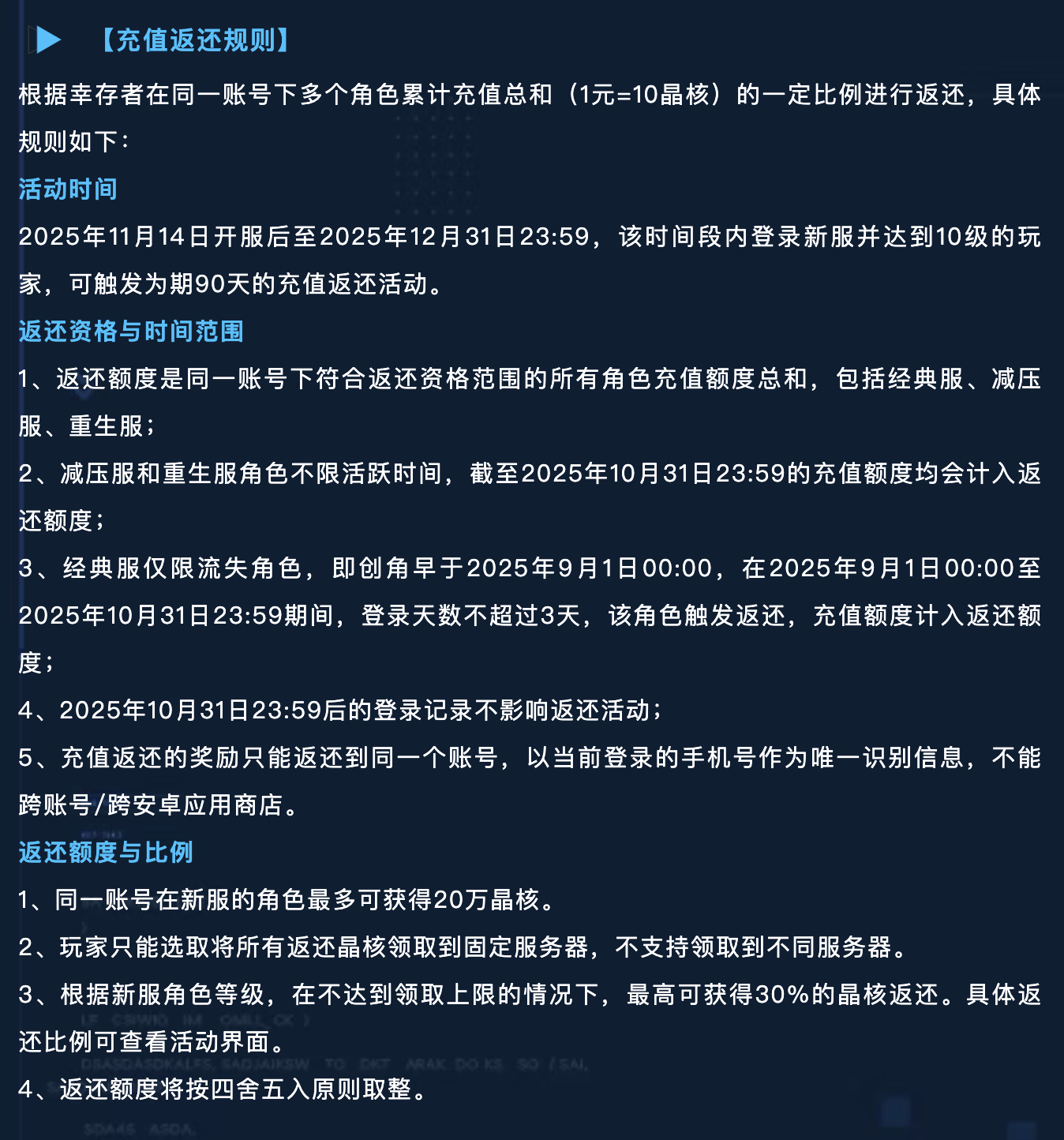 - 返还资格超友好:返还额度涵盖同一账号下经典服、减压服、重生服的充值都算,减压服和重生服不限活跃时间,经典服流失角色(9月1日前创角、在2025年9月1日00:00至2025年10月31日23:59期间,登录天数不超过3 天)也能参与。
