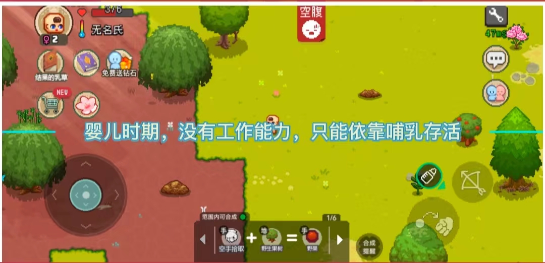 婴儿时期,玩家会随机降生在一个家庭,家庭中每个人都会为新生命的到来而感到喜悦。虽然你不能对家园的建设起到任何作用,但是“母亲”(身份)依旧坚持边带着你边进行工作。家里的长者也会尽自己所能照顾你,来分担“母亲”的工作。