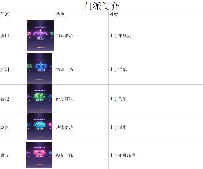 游戏提供了唐门、弈剑、普陀、龙宫、青丘五大门派,每个门派都有自己的特色。