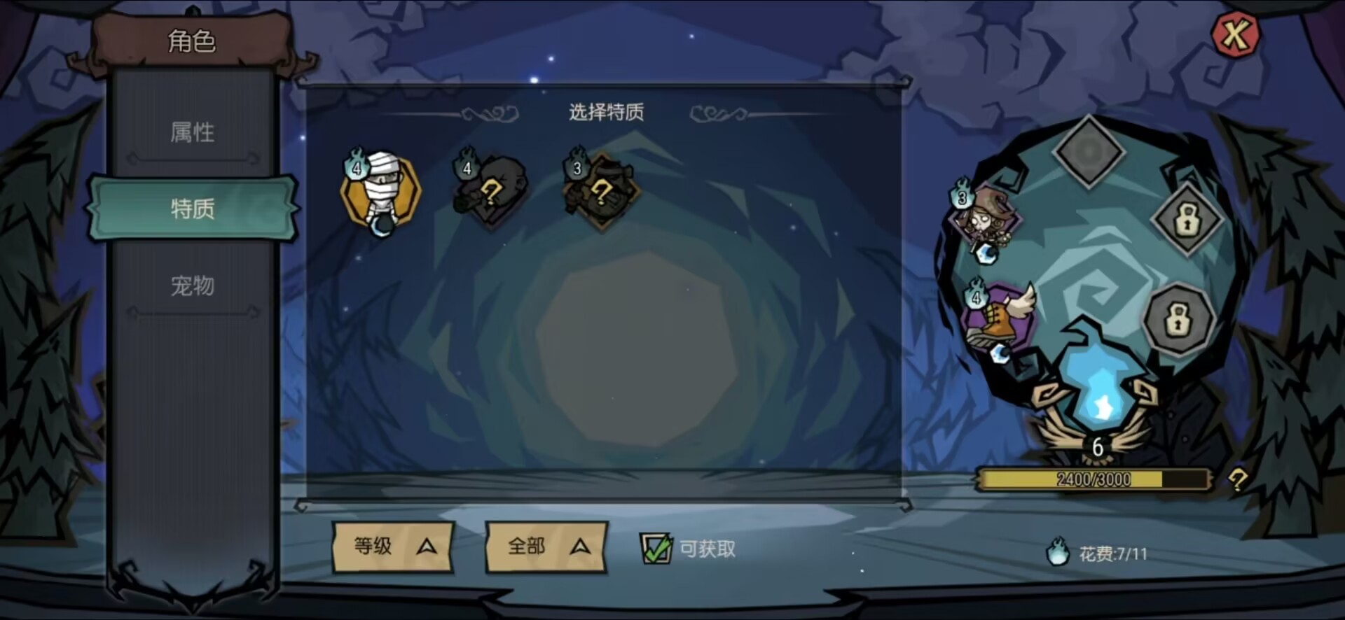 答案就是我们的技能,我们可以在游戏中获得一定的特质,然后随着我们特质等级的提升会逐步解锁我们的特质位置(技能槽),一共五个技能槽位。