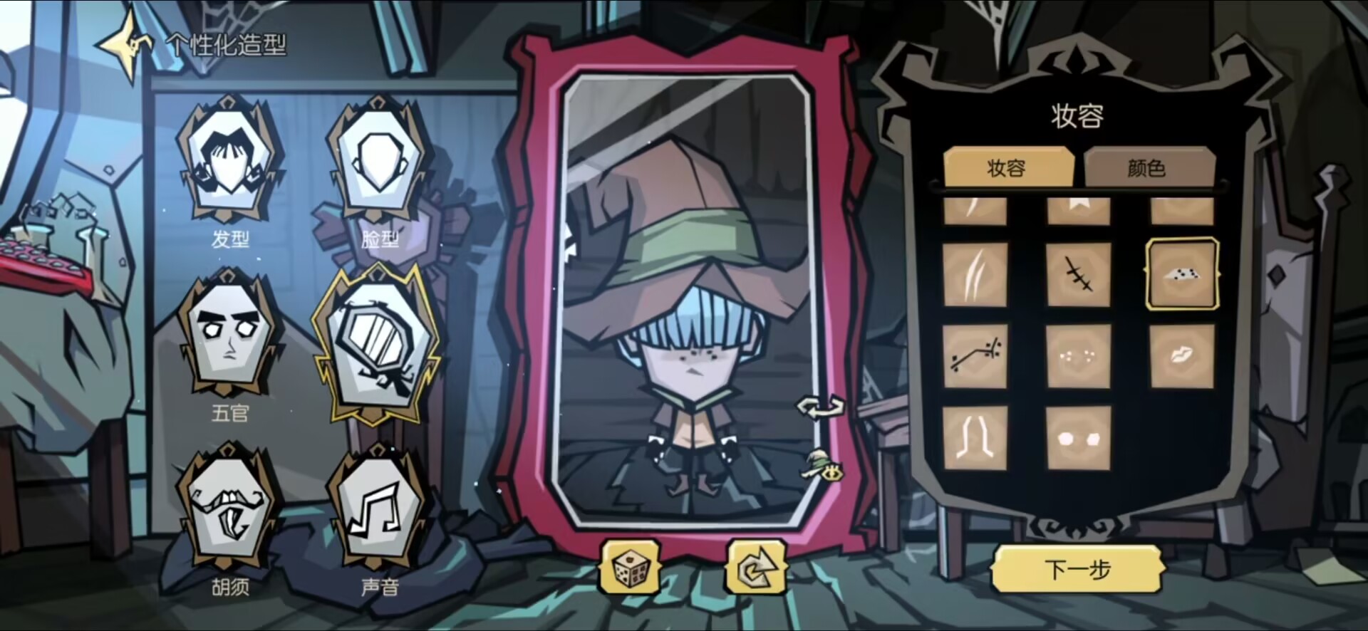 《饥荒●新家园》虽然游戏不大,但是游戏依旧是配备了比较完备的角色造型系统。每个角色的发型、脸型、五官、胡须包括声音都可以自己定制。每个种类都有着几十种选项,可以随心搭配出各种造型,而且还有多种颜色可以搭配。