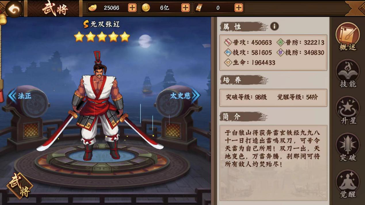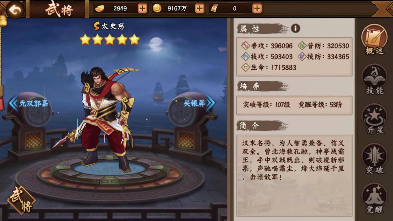 2、太史慈:太史慈是新近推出的武将之一,也是当前竞技玩法中的当红武将。其拥有致盲、减速、霸体、破霸体、眩晕、混乱对手等非常不错的竞技效果,长距离的冲刺仅次于祝融,且自身伤害同样不俗,加上二技能极强的先手优势,可谓综合排位能力极强,除了自身血量不占优势外没有明显短板,是非常值得一用的单挑型武将。