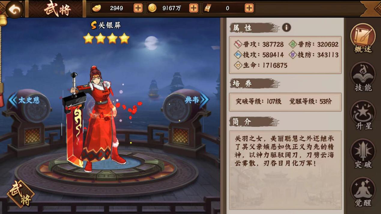 3、关银屏:关银屏如今可谓大红大紫,作为最新推出的女武将,造型也非常耐看,一把超级醒目的大刀及其亮眼。而且,关银屏具备吸附、霸体、眩晕、禁足、免控、破霸体、范围追踪、沉默并封禁对手所有技能、提升自身50%移速等强大竞技效果,更是配合技能可以打出超高频次的普攻伤害,相信在排位赛里碰到了她的主公应该对她在现版本的强势是感同身受了吧,如果是遇到单挑的情况,关银屏非常推荐使用。