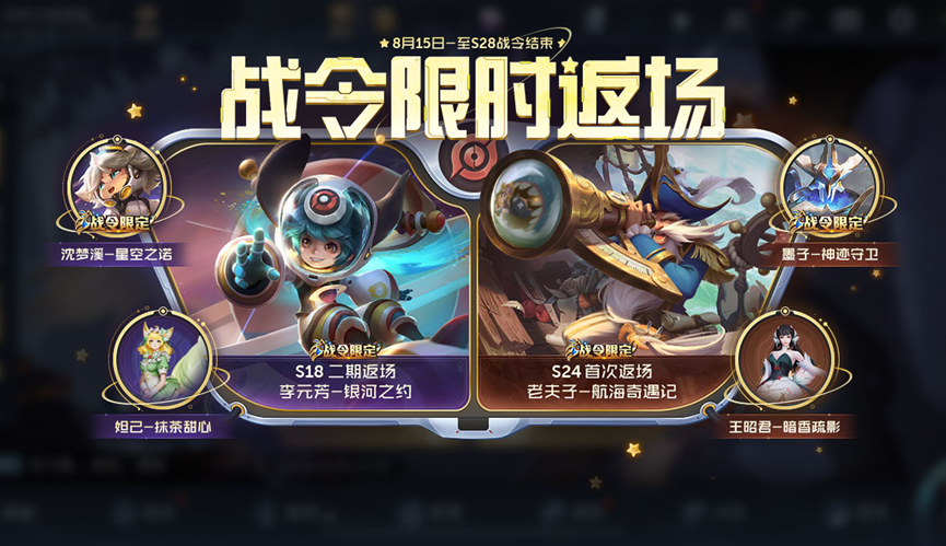 现在官方会玩了呀,皮肤返场活动要不就没有,一上架就是多款一起,前有李逍遥、青龙志、天狼绘梦者三款一起返场,后又玄武志、瑞麟志、朱雀志一起,现在更是7款皮肤一起返场,妲己的热情桑巴,S18赛季的战令限定皮肤,李元芳-银河之约、沈梦溪-星空之诺、王昭君-暗香疏影,S24赛季的战令限定皮肤,老夫子-航海奇遇记、墨子-神迹守卫、妲己-抹茶甜心。