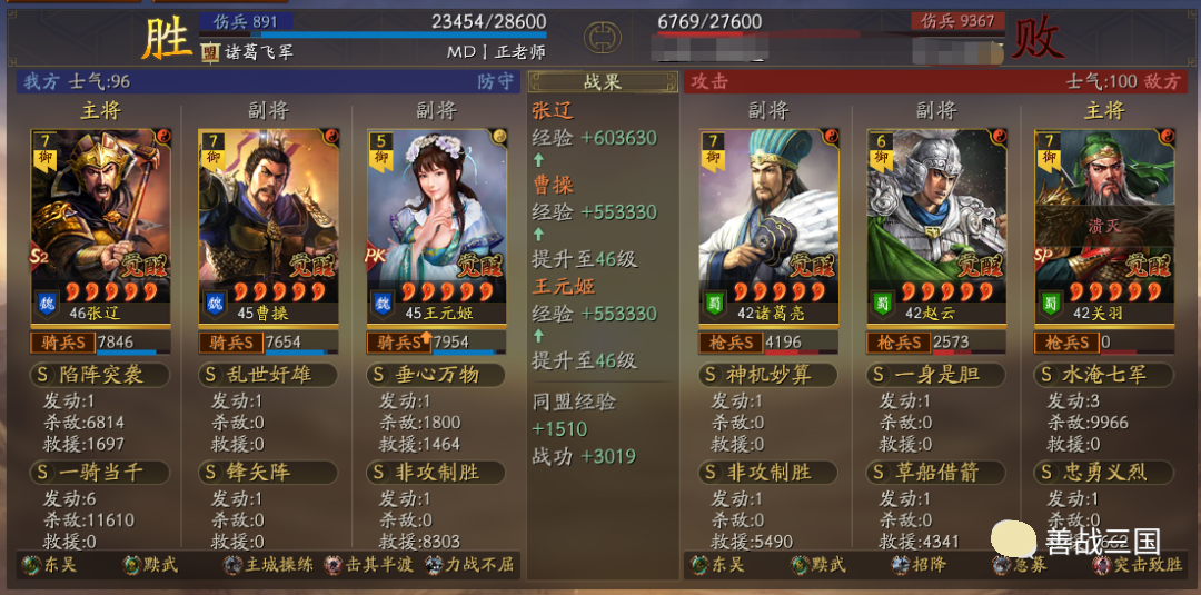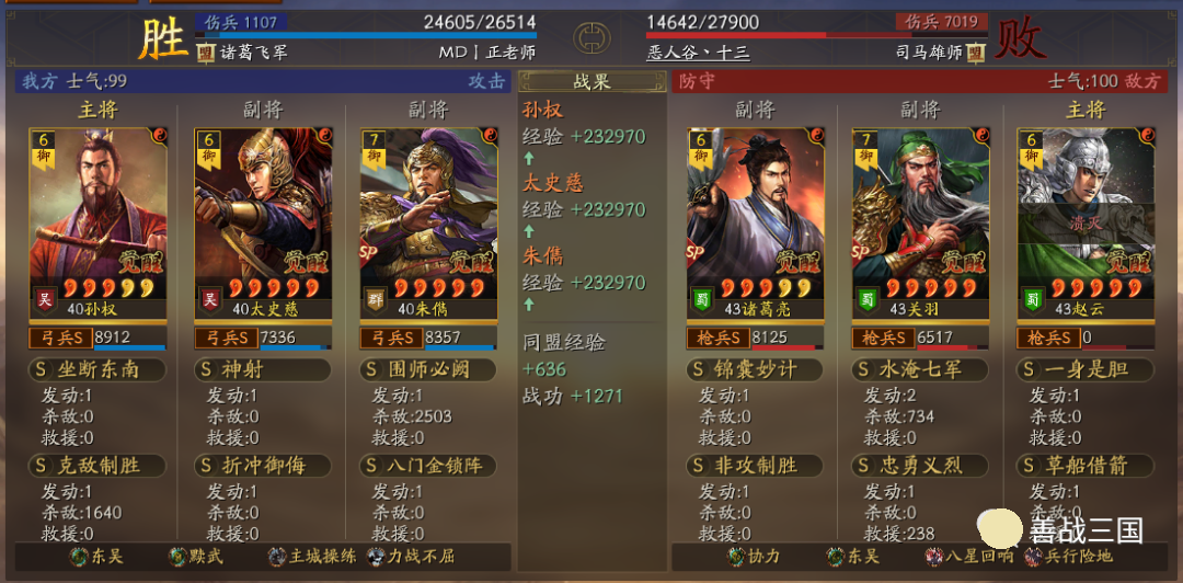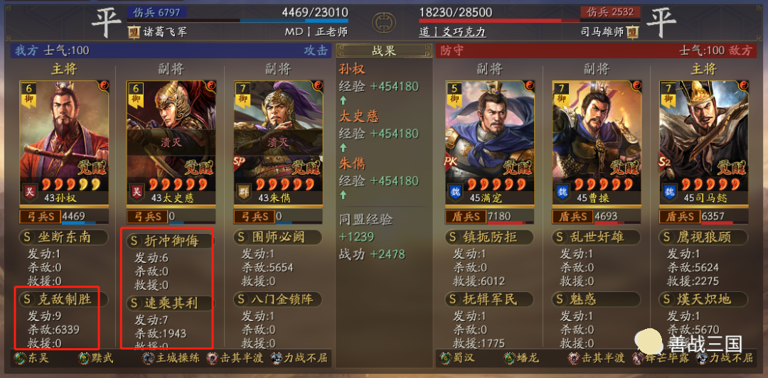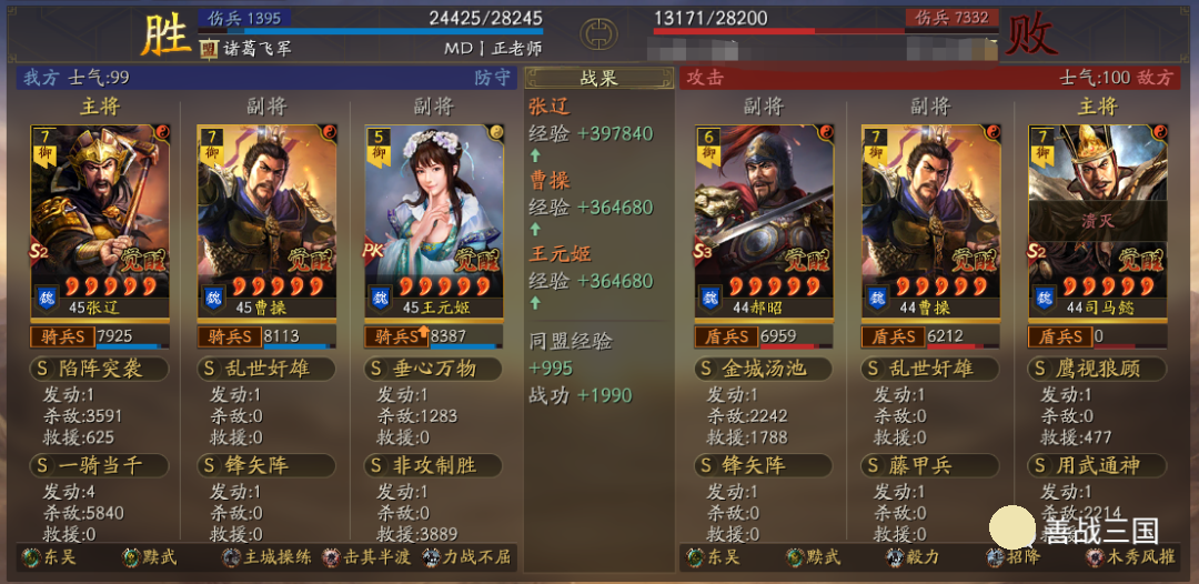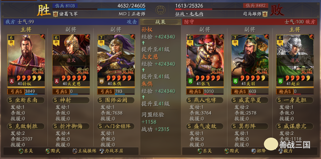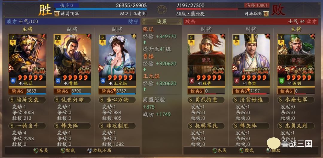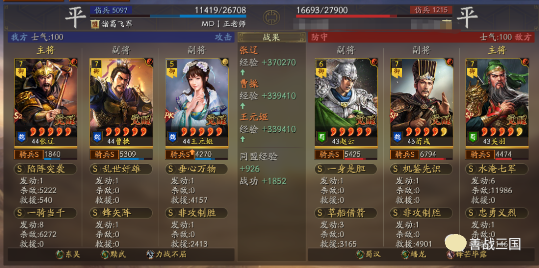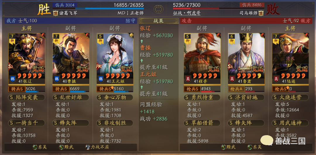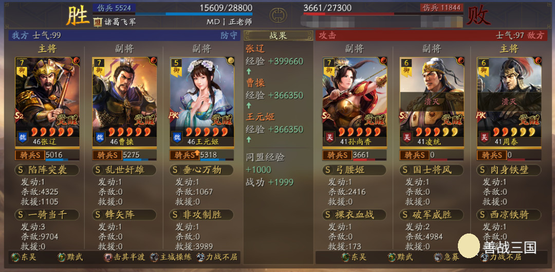 出队思路:黩武是8回合加成,而且后5回合加成更高;而王元姬、锋矢阵、曹操这些也都增益8回合,考虑到特性是双方相同的,对方也会有协力或是蟠龙的肉队,所以单纯出速攻队不行,就用了续航搭配的草船+非攻