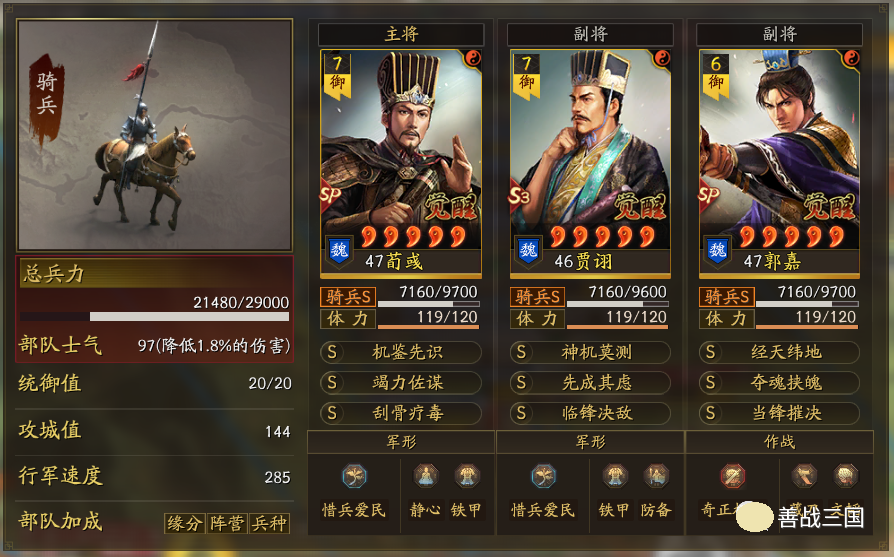 协力:部队中三名武将阵营均不相同时,全队武将属性40点
