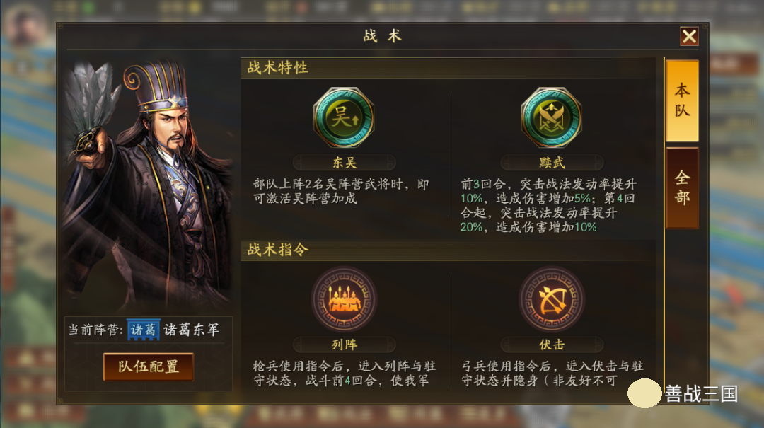 出队思路:战术指令随到的是【伏击】驻守时会隐身交战会加属性,所以考虑出一队弓兵,又想到龙虎里法系阵容非常多,所以搭配朱儁可以压制法系,孙权和太史慈也克制很多慢速法系队